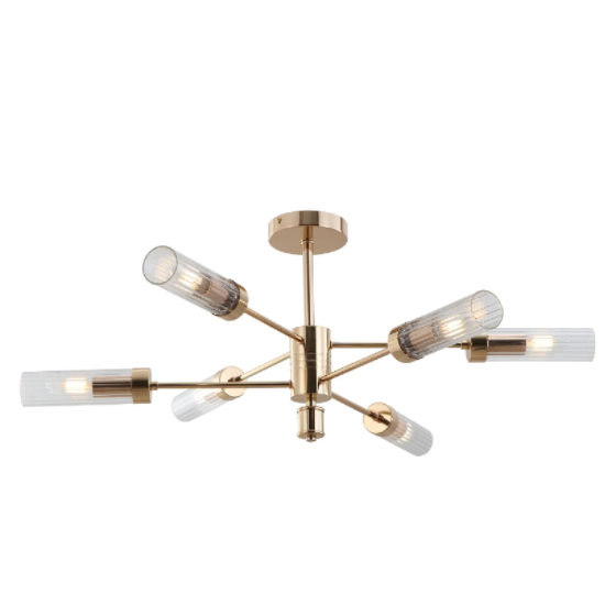 Confecționată pentru interioarele contemporane, această lumină de plafon cu 6 nuanțe din aur cu 6 nuanțe puternice prezintă șase nuanțe subțiri, de sticlă înghețată, cu nervuri, care creează o strălucire moale, fără strălucire. Tuburile verticale de sticlă îmbunătățesc dispersia ușoară, făcând camerele să se simtă mai luminoase și mai primitoare. Finisajul de aur electroplat francez adaugă o notă de lux, în timp ce rezistă la ternisire, asigurând o strălucire de lungă durată.